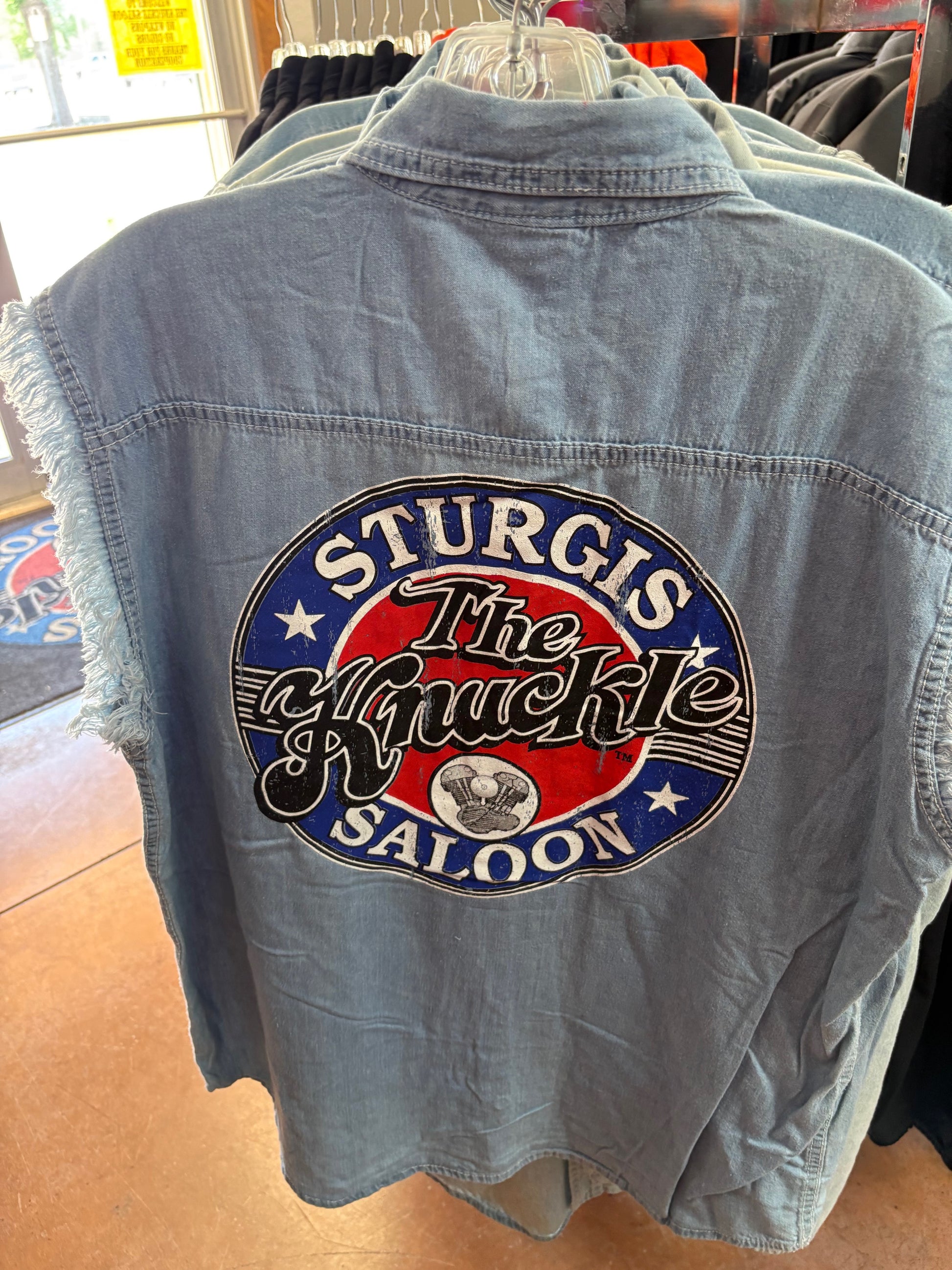 Turn heads and ride in style with the Knuckle Saloon Denim Cutoff Vest, the ultimate statement piece for bikers, rally-goers, and Knuckle fans. This rugged vest features a bold, distressed Sturgis, The Knuckle Saloon back patch with the iconic knucklehead engine design—built for those who live life wide open.